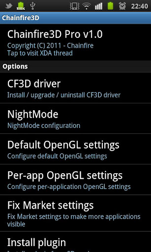 What does that mean? It means that Chainfire3D sits between your apps and the graphics drivers, and can intercept and/or change commands between the two. It has some built-in functions, and can be further extended with plugins to provide extra functionality.