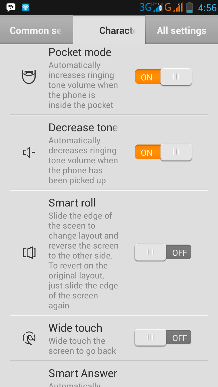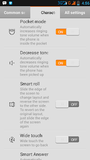 Pengaturannya juga terdapat menu-menu pintar seperti 'Pocket Mode' yang bertugas menyaringkan volume ketika ponsel ada di saku celana, lalu ada 'Smart Answer' yang bertugas untuk menjawab panggilan masuk secara otomatis ketika ponsel kita dekatkan ke telinga, jadi dengan menu ini kita tidak perlu menjawab panggilan dengan menekan tombol jawab. Di menu pengamanan atau security ada juga menu tambahan berupa 'voice unlock'. Fungsinya tidak lain untuk membuka kunci tombol dengan suara kita.